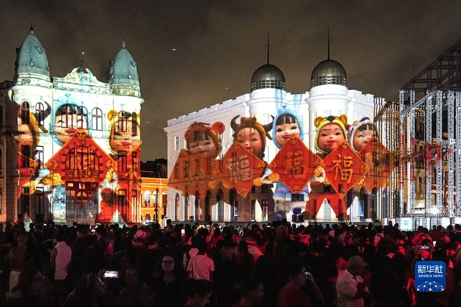 2023年1月19日,在巴西累西腓市舉行的中國(guó)春節(jié)慶?;顒?dòng)上,大型燈光秀點(diǎn)亮夜空。新華社發(fā)(保羅·洛佩斯攝)