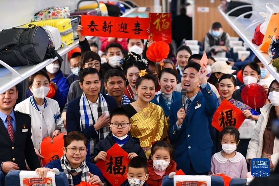 2023年1月19日,奔馳在中老鐵路上的C272次列車車廂內(nèi),以“中老一家親,祥和中國(guó)年”為主題的列車春晚精彩上演。這是旅客與演員在車廂內(nèi)合影。新華社記者 江文耀 攝