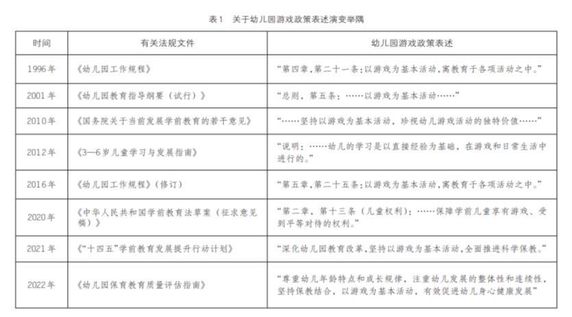 第二,第二,幼兒游戲權(quán)的學(xué)前教育依法治理。安吉游戲的模式體現(xiàn)著學(xué)前教育工作者規(guī)范辦園,提質(zhì)賦能幼兒園師資隊(duì)伍建設(shè),克服小學(xué)化的教育理念,是學(xué)前教育依法治理的重要環(huán)節(jié),而游戲作為幼兒的一項(xiàng)權(quán)利,也經(jīng)歷了從理解、探索到立法的過程(見表1)。