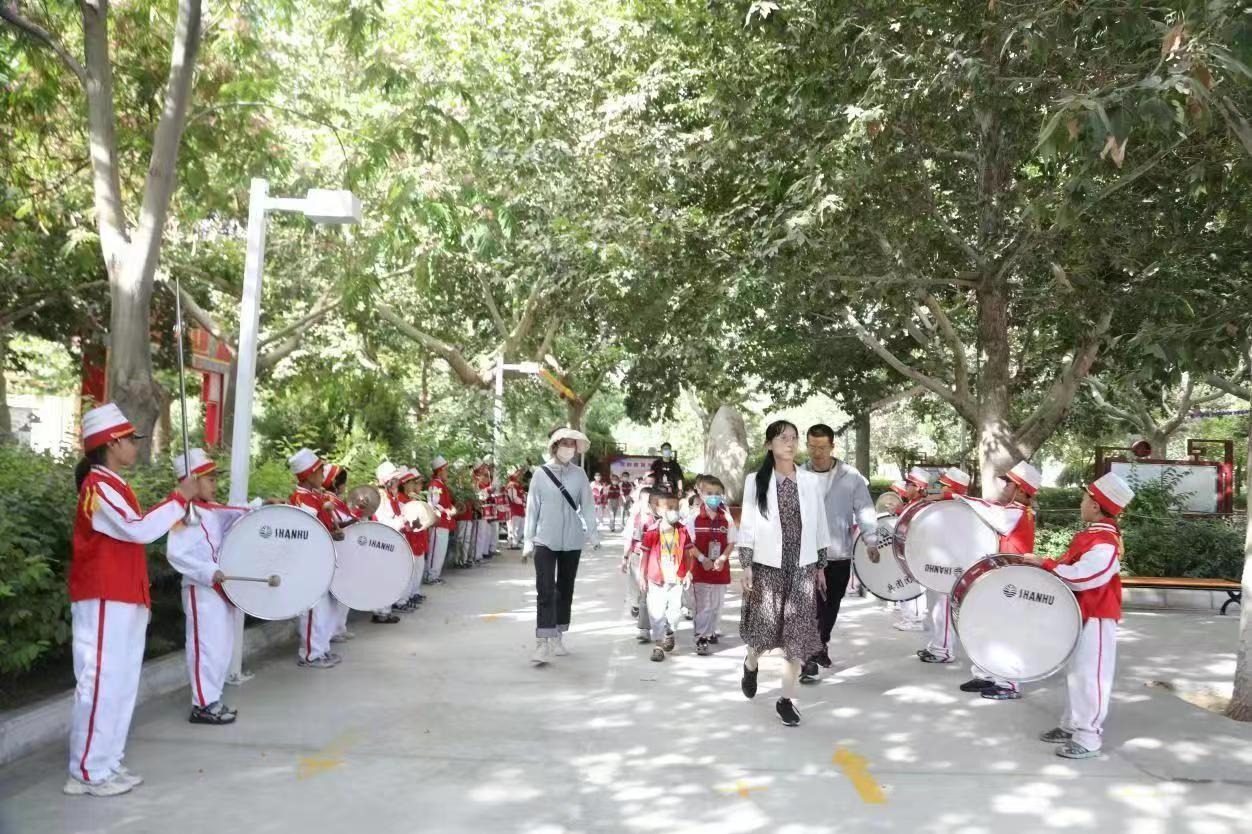 新疆生產(chǎn)建設(shè)兵團(tuán)第十四師皮山農(nóng)場(chǎng)中學(xué)小學(xué)部鼓號(hào)隊(duì)學(xué)生歡迎幼兒園大班學(xué)生參觀小學(xué)校園。張恒供圖