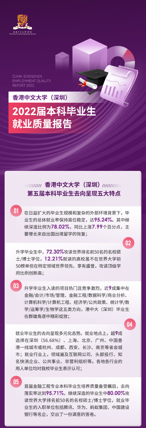 中國教育新聞網(wǎng)訊(記者 焦小新)2月26日,香港中文大學(xué)(深圳)正式發(fā)布2022屆本科畢業(yè)生就業(yè)質(zhì)量報(bào)告。報(bào)告顯示:2022屆畢業(yè)生在保持高就業(yè)率的基礎(chǔ)上,在名校入讀比例、熱門升學(xué)項(xiàng)目、就業(yè)薪酬水平、就業(yè)領(lǐng)域多元化等方面取得高質(zhì)量成果。畢業(yè)生去向呈現(xiàn)以下五大特點(diǎn):