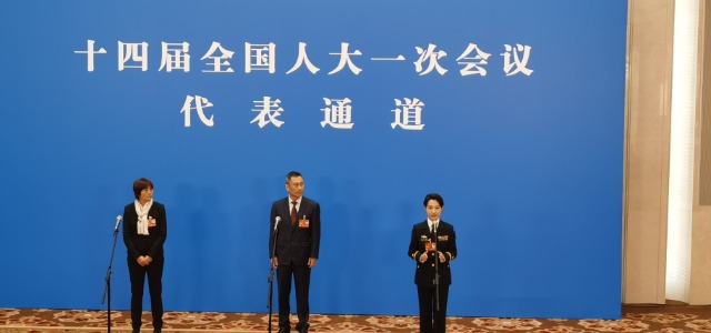 3月5日上午,十四屆全國人大一次會議舉行首場“代表通道”采訪活動。全國人大代表、海軍遼寧艦?zāi)持嘘犐傩U谓虒?dǎo)員朱悅萌(右1)接受采訪。林煥新 攝