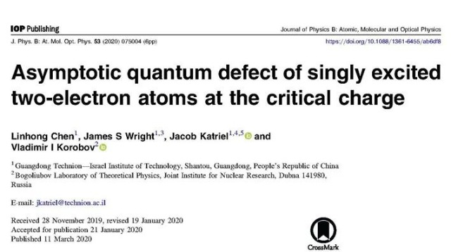 2019年,這顆默默扎根的種子終于破土而出。大二期間,陳林泓憑借優(yōu)異的成績脫穎而出,獲得教授邀請參與科研項(xiàng)目,并前往俄羅斯杜布納聯(lián)合核子研究所(JINR)進(jìn)行學(xué)習(xí)。隨后,陳林泓以第一作者在國際物理期刊《物理學(xué)報(bào)B:原子、分子與光學(xué)物理》(Journal of Physics B: Atomic, Molecular and Optical Physics)上發(fā)表學(xué)術(shù)論文,成為首位以第一作者身份在SCI期刊上發(fā)表論文的廣以學(xué)子。