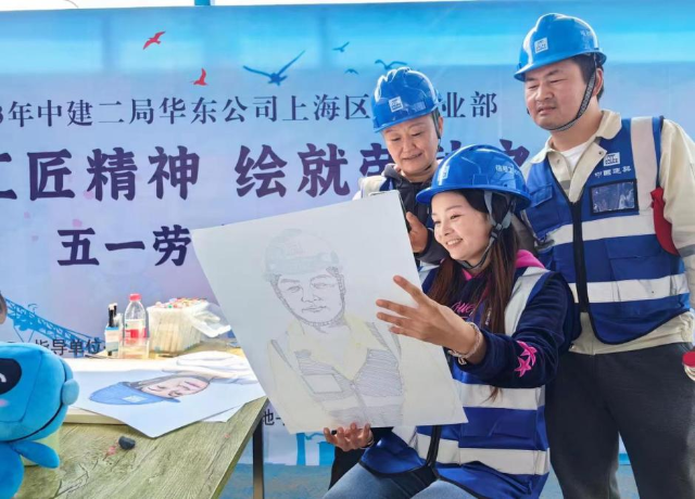 塔吊、水電和鋼筋等多個工種的工人參與了畫像活動,他們擺出自己最帥、最好看的姿勢幸福地體驗著畫像活動。