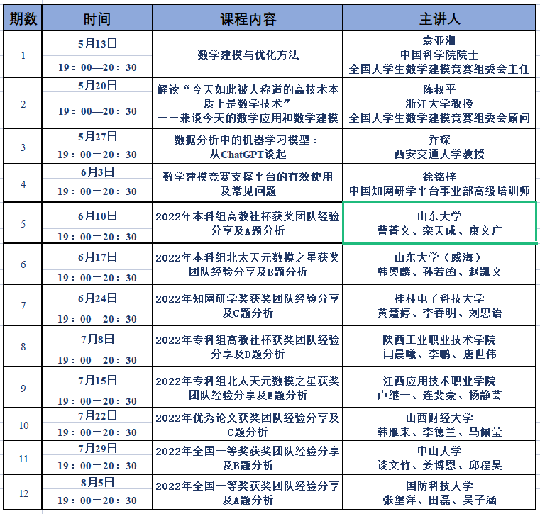 另邀請在2022年競賽中取得好成績的來自山東大學(xué)、中山大學(xué)等8支高校學(xué)生團隊進行分享,幫助同學(xué)們更深入了解競賽技巧與方法,提升同學(xué)們的競賽能力和水平。“數(shù)學(xué)建模大講堂”主要為有志于在全國大學(xué)生數(shù)學(xué)建模競賽中嶄露頭角的大學(xué)生提供相關(guān)備考攻略。