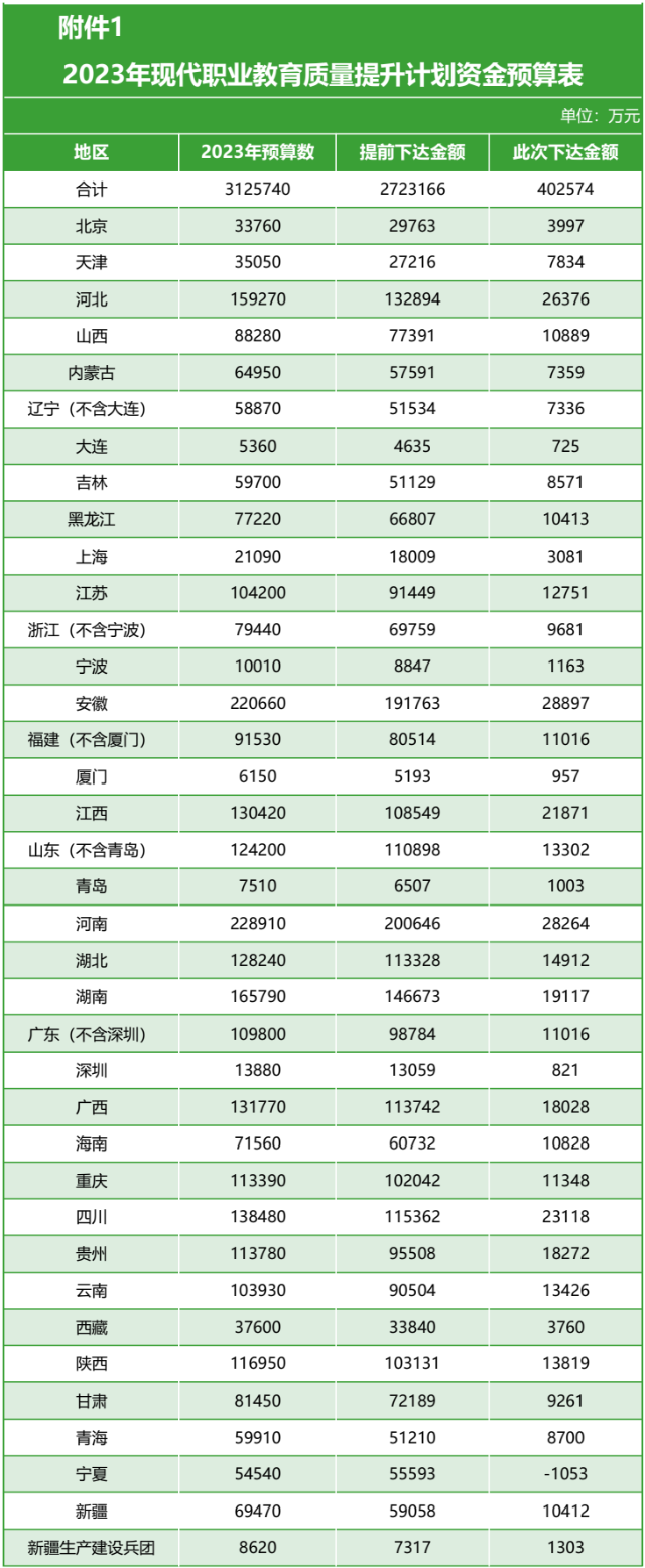 中國教育報-中國教育新聞網(wǎng)訊(記者 歐媚)記者近日從財政部獲悉,教育部、財政部印發(fā)《關(guān)于下達(dá)2023年現(xiàn)代職業(yè)教育質(zhì)量提升計劃資金預(yù)算的通知》,下達(dá)2023年現(xiàn)代職業(yè)教育質(zhì)量提升計劃資金預(yù)算。此次下達(dá)金額為402574萬元,加上提前下達(dá)的2723166萬元,共下達(dá)2023年現(xiàn)代職業(yè)教育質(zhì)量提升計劃資金預(yù)算3125740萬元,比上年增加10億元。