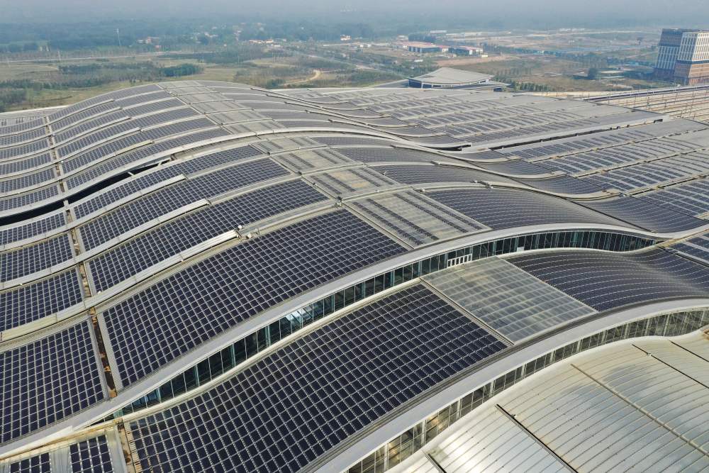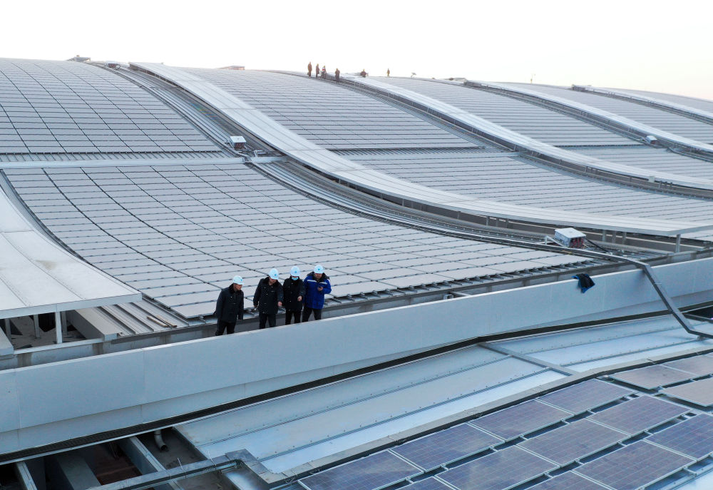 雄安站站頂分布式光伏電站,電站采用自發(fā)自用、余電上網(wǎng)模式(2022年9月9日攝,無(wú)人機(jī)照片)。