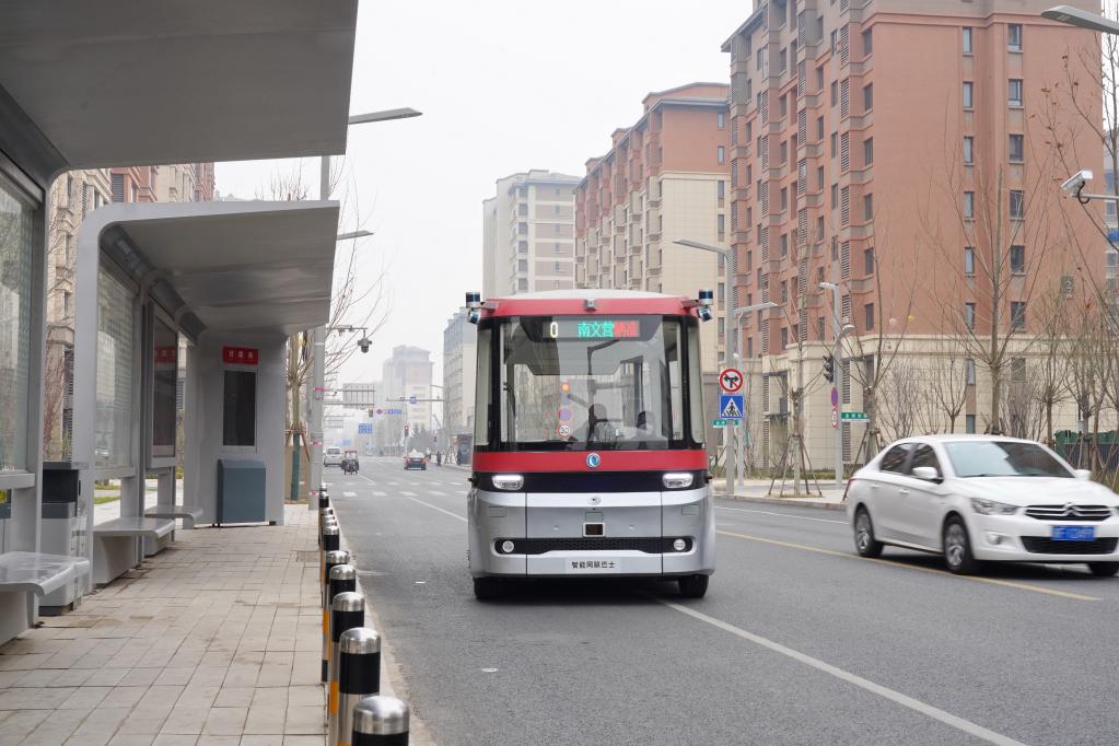 智能網(wǎng)聯(lián)巴士901線測試車在河北雄安新區(qū)容東片區(qū)道路上行駛(2023年3月20日攝)。新華社記者 牟宇 攝