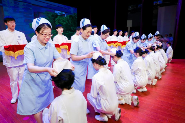 護理行業(yè)專家們共同為即將走上實習崗位的學生授帽。學校供圖