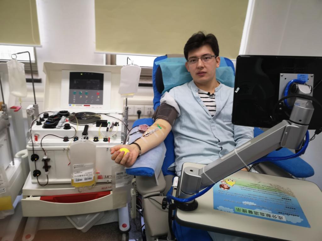 魯斯蘭在北京市紅十字血液研究所獻(xiàn)血(2018年5月22日攝)。新華社發(fā)
