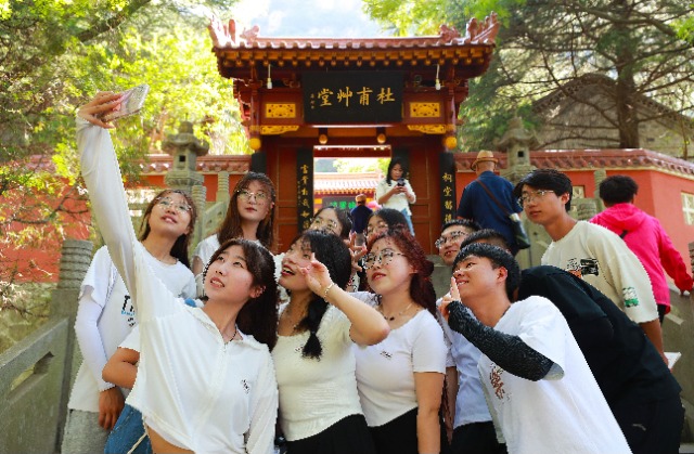 現(xiàn)場(chǎng)授課結(jié)束后,學(xué)生在杜甫草堂前合影留念。