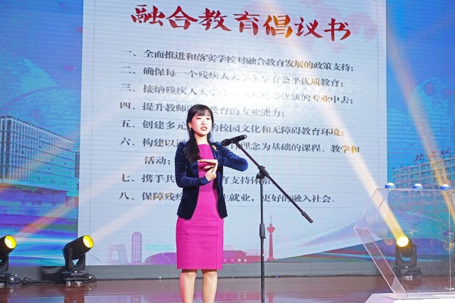 北京聯(lián)合大學(xué)特殊教育學(xué)院教師曲欣宣讀融合教育倡議書 北京聯(lián)合大學(xué)特殊教育學(xué)院供圖