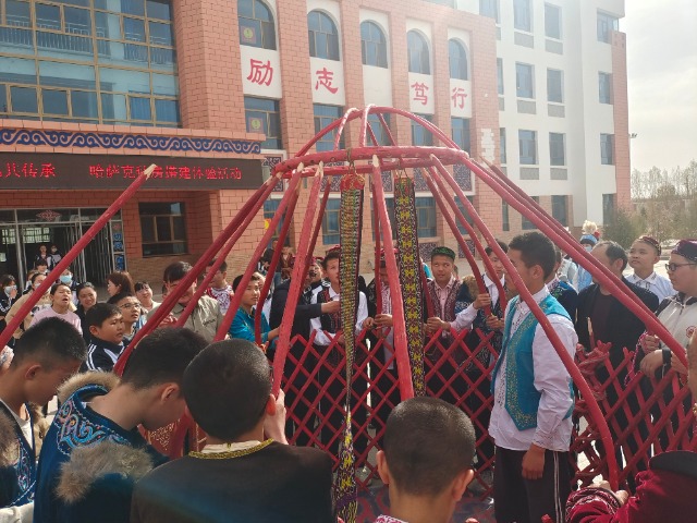 甘肅省阿克塞哈薩克族自治縣中學(xué)學(xué)生體驗(yàn)氈房搭建。向國(guó)忠 供圖