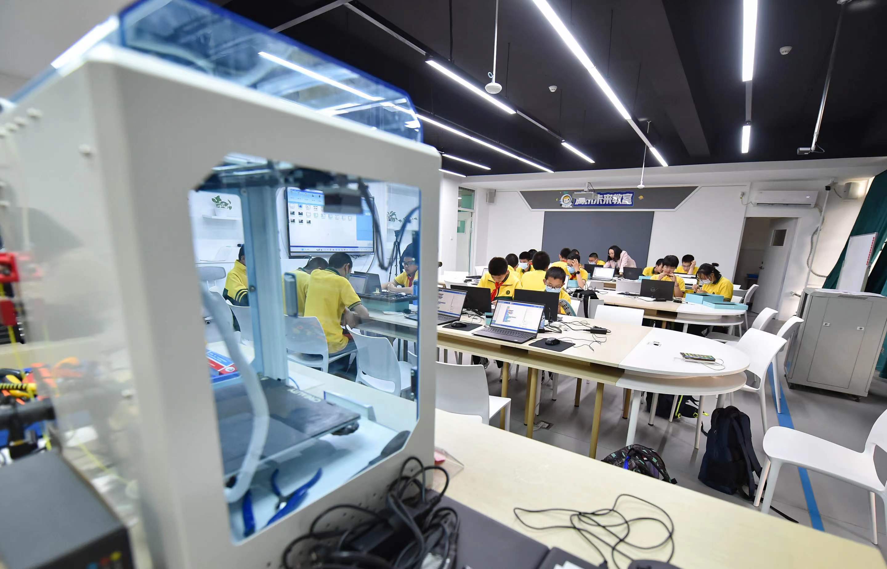 該校執(zhí)行校長(zhǎng)王強(qiáng)介紹,目前,未來(lái)教室除了承載小學(xué)、初中、高中學(xué)生的一些常規(guī)課程外,還開(kāi)設(shè)有3D打印、人工智能、計(jì)算機(jī)編程等豐富的興趣類課程,“這是我們學(xué)校使用頻率最高,也最受歡迎的一間教室”。