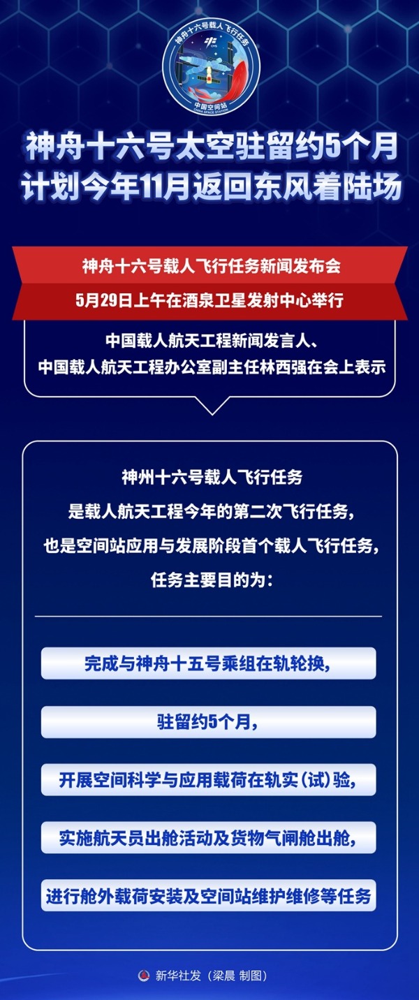 新華社酒泉5月29日電 神舟十六號(hào)載人飛行任務(wù)新聞發(fā)布會(huì)5月29日上午在酒泉衛(wèi)星發(fā)射中心舉行。中國載人航天工程新聞發(fā)言人、中國載人航天工程辦公室副主任林西強(qiáng)在會(huì)上表示,神舟十六號(hào)載人飛船駐留約5個(gè)月,計(jì)劃于今年11月返回東風(fēng)著陸場(chǎng)。