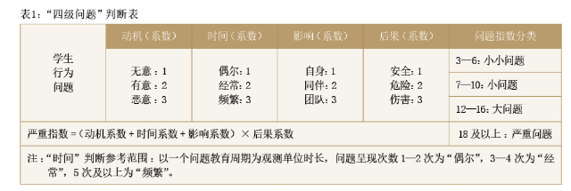 學校在常態(tài)下,需要教師能較為正確地判斷學生問題的嚴重程度,便于選擇適切跟進力量及教育方式。根據(jù)學生行為問題形成的發(fā)展趨勢,學校形成了關聯(lián)學生日常行為表現(xiàn)進行綜合判斷的判斷表,依據(jù)學生行為問題的“故意度”“經(jīng)常性”“影響力”及“后果”來設定系數(shù),利用公式計算確定問題嚴重指數(shù),形成“四級問題”判斷表(見表1),識別學生問題,以求分類跟進。