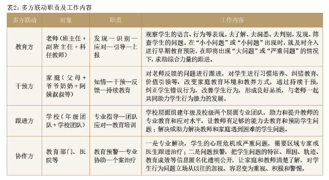 基于學生視角,以更適切學生成長規(guī)律、貼近學生內(nèi)心的教育方式,對學生問題進行科學有效的引領預防和教育,需要改變教師單方應對的單一方式,策略性尋求各方教育力量,形成全域視野下的家庭、教師、學校及教育部門共同參與的“多方聯(lián)動”體系,著力于學生行為問題的識別及學生問題預防機制建設,引領學生健康成長。