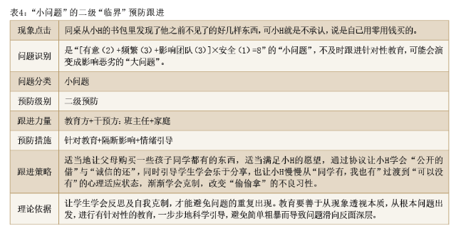 因?qū)W生個性習慣、認識不足、不恰當需求或同伴影響等引發(fā)的“小問題”,需要通過引領學生正向行為、隔斷負面影響和消解消極情緒等,避免類似問題再次發(fā)生(見表4)。