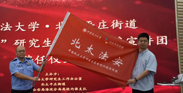 隨后,北太平莊街道平安辦主任朱止興、研究生工作辦公室主任張永然教授為“北太法安”研究生反電信詐騙宣講團(tuán)成員代表頒發(fā)聘書,北太平莊派出所社區(qū)民警魏增巍為團(tuán)隊授旗。
