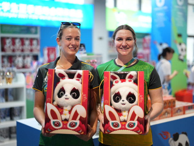 澳大利亞水球隊的露辛達·蘇珊(左)和隊友展示剛剛買到的兔年版“蓉寶”。
