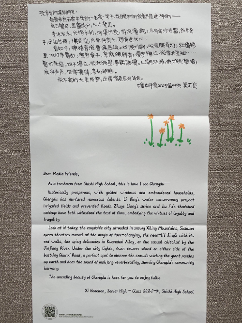 圖為四川省成都市石室中學高2025屆4班奚浩宸親筆書寫的信件。