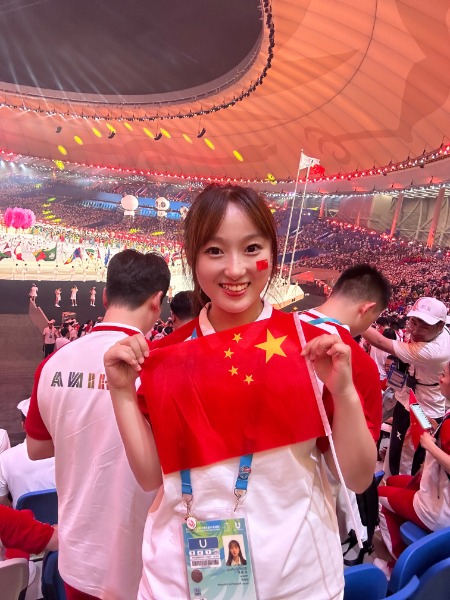 宋翠芳在參加大運(yùn)會(huì)開幕式。河南理工大學(xué)供圖