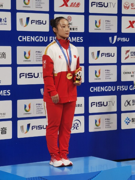 在本次成都大運(yùn)會(huì)女子南刀決賽中,宋翠芳原本是第六個(gè)出場(chǎng)。但是由于前一位菲律賓選手比賽中不慎受傷,正在熱身的宋翠芳提前上場(chǎng)。她沒有受到這種意外的任何影響,以良好的心態(tài)、自如的表演,躍居榜首,最終以出色的表現(xiàn)奪得冠軍,為中國代表團(tuán)奪得第二枚金牌。
