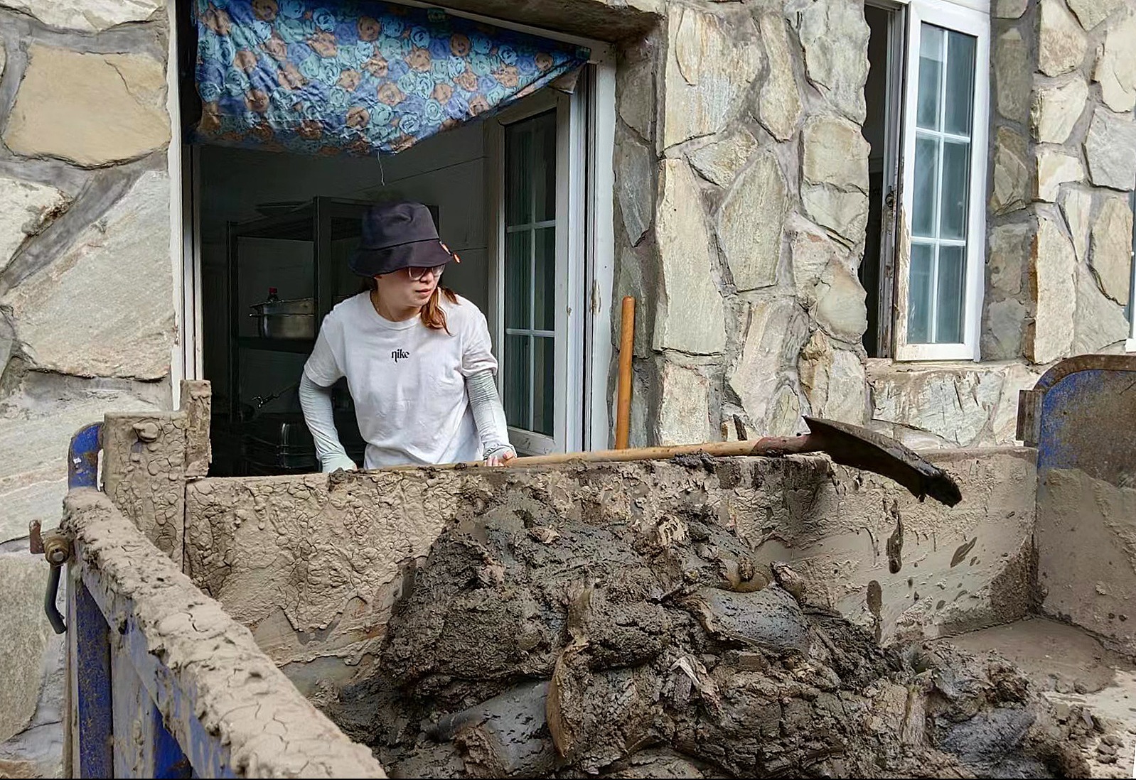 8月23日,淶水縣龍門小學(xué)老師在清理宿舍淤泥。