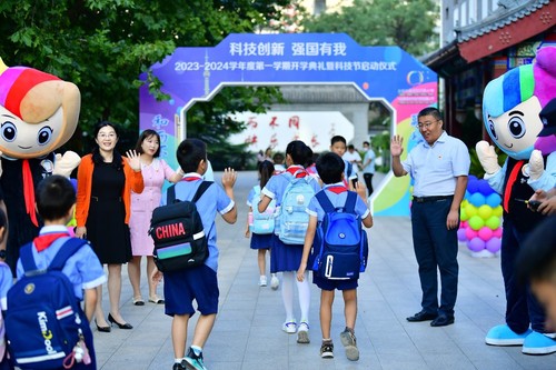 中國(guó)教育報(bào)-中國(guó)教育新聞網(wǎng)訊(通訊員 李典)9月1日,北京市海淀區(qū)民族小學(xué)新學(xué)期開(kāi)學(xué)典禮暨科技節(jié)啟動(dòng)儀式舉行。典禮以“科技創(chuàng)新,強(qiáng)國(guó)有我”為主題?,F(xiàn)場(chǎng)儀式感滿滿、科技氛圍感十足。操場(chǎng)兩側(cè),舞臺(tái)前方的紅毯上,家長(zhǎng)和老師共同撐起“愛(ài)心傘”,迎接一年級(jí)的新生入場(chǎng)?!皭?ài)心傘”由美術(shù)老師帶領(lǐng)高年級(jí)的哥哥姐姐們親手繪制,飽含民小全體師生對(duì)新生們滿滿的愛(ài)意和祝福。