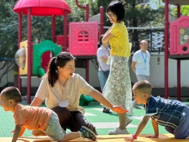 秀園幼兒園教師陪孩子戶外活動 幼兒園供圖