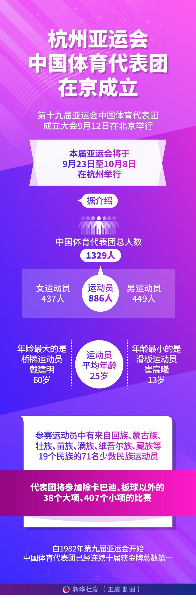 本屆亞運會將于9月23日至10月8日在杭州舉行。據(jù)介紹,中國體育代表團(tuán)總?cè)藬?shù)達(dá)1329人,其中運動員886人(女運動員437人,男運動員449人)。運動員平均年齡25歲,年齡最大的是橋牌運動員戴建明,60歲;年齡最小的是滑板運動員崔宸曦,13歲。參賽運動員中有來自回族、蒙古族、壯族、苗族、滿族、維吾爾族、藏族等19個民族的71名少數(shù)民族運動員。代表團(tuán)將參加除卡巴迪、板球以外的38個大項、407個小項的比賽。