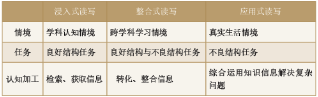 不同情境下的三類讀寫并非截然分開,而是呈現(xiàn)進階升級又互相聯(lián)通的關系。學習情境從學科認知情境到跨學科學習情境到真實生活情境,問題任務從良好結構到不良結構,認知加工從獲取信息的淺加工到整合運用知識解決真實和復雜問題的深度加工,最終實現(xiàn)由做題到做事到做人,由知識到素養(yǎng),由單一學科素養(yǎng)到融合發(fā)展素養(yǎng)的讀寫模式轉型。