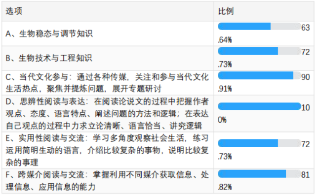 應用式讀寫重在“通過讀寫學習”解決真實問題,同時在遷移應用中“學習讀寫”,做到兩者的兼顧與平衡。北京市亦莊實驗中學和北京四中作為項目實驗學校,均在疫情期間開發(fā)了應用式讀寫課程,以項目化學習的方式進行教學實踐,成效顯著。亦莊實驗中學以“作為國家民間智庫的研究員,全面研究2020年疫情并形成《國家突發(fā)公共衛(wèi)生事件應急預案》”為核心任務,開展跨學科項目化學習,所有模塊的學習都以讀寫作為學習手段。如模塊一“認識新冠疫情的真面目”,其任務是提交一篇科普短文并錄制中英雙語的宣傳視頻,完成一次科學普及活動。該項目化學習的最終成果是以小組為單位形成《國家突發(fā)公共衛(wèi)生事件應急預案》,“預案”需要運用前幾個模塊的結論與圖表,并插入組織結構圖與流程圖。此課程的學科融合度、項目化程度高,以讀寫作為學習方式和思維方式完成真實任務、解決真實問題,促進了學生科學素養(yǎng)與人文素養(yǎng)的綜合提升。北京四中則開展以“病毒和疫苗”為主題的項目式學習,項目組的語文和生物教師,希望“能和同學們一起從我們的課桌、我們的作業(yè)、我們的考綱中抬起頭來,重新學習點什么,思考點什么,并將所學所思投入這場尚未結束的災難”。課程結束后,課題組組織了問卷調研,其中一道題的調研數(shù)據(jù)如表2。