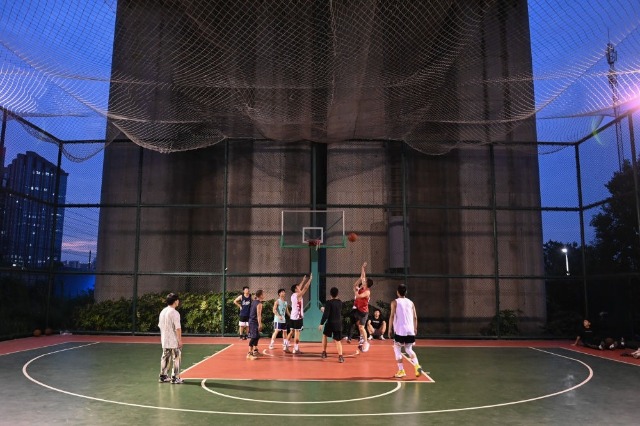 市民在位于高鐵橋下的浙江杭州錢江世紀(jì)城體育公園打籃球(2022年9月20日攝)。新華社記者 黃宗治 攝