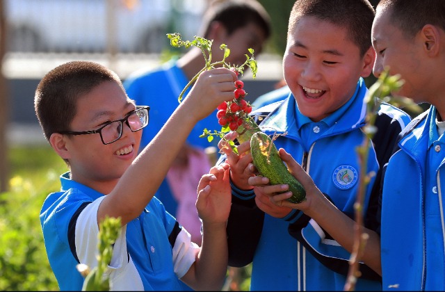 9月27日,在金塔縣第四中學(xué)的開心農(nóng)場,七年級學(xué)生比拼自己的采摘成果。