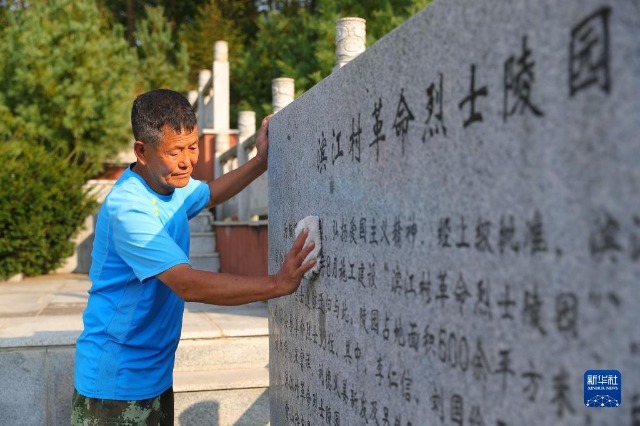 在遼寧省丹東市振興區(qū)濱江村,村民擦拭濱江村革命烈士陵園石碑(2022年9月26日攝)。新華社記者 楊青 攝