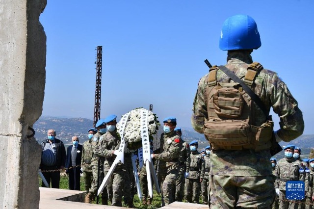 中國維和官兵在黎巴嫩南部希亞姆鎮(zhèn)向烈士紀念碑敬獻花圈(2021年4月4日攝)。新華社發(fā)(丁文棟 攝)