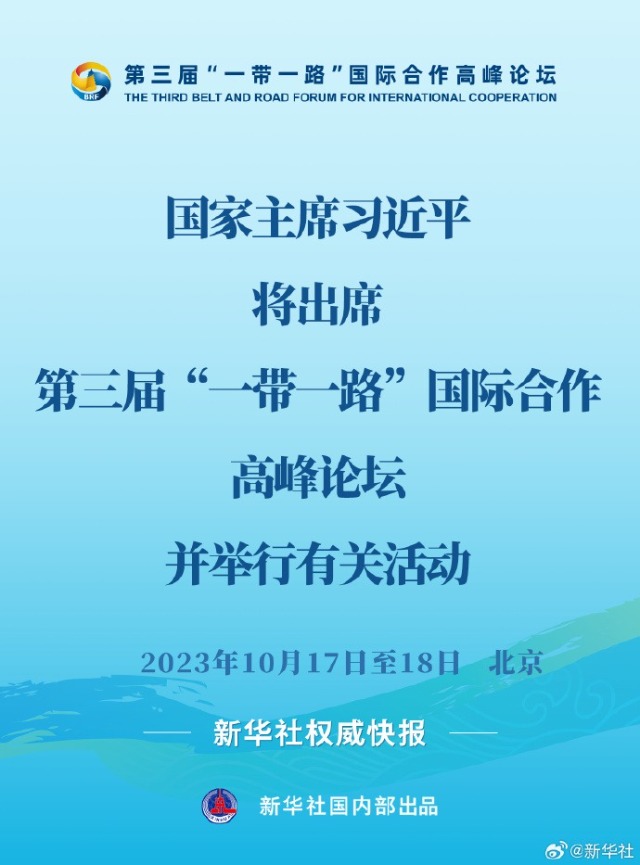 外交部發(fā)言人華春瑩10月11日宣布:第三屆“一帶一路”國際合作高峰論壇將于10月17日至18日在北京舉行,主題為“高質(zhì)量共建‘一帶一路’,攜手實現(xiàn)共同發(fā)展繁榮”。國家主席習近平將出席高峰論壇開幕式發(fā)表主旨演講,并為來華出席高峰論壇的嘉賓舉行歡迎宴會和雙邊活動。