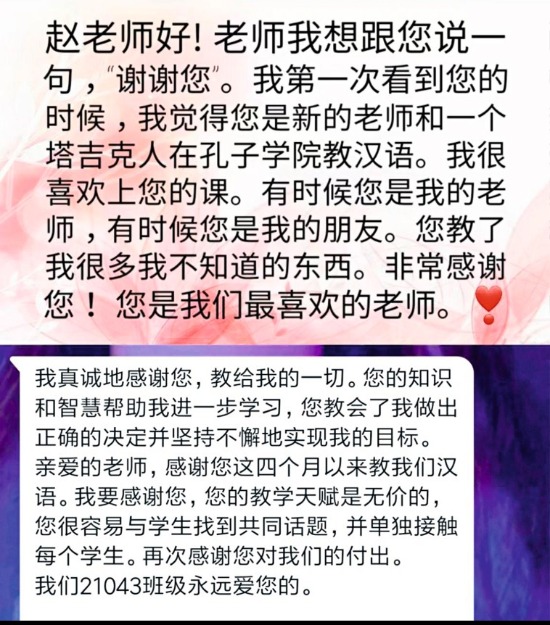 我出生在塔吉克斯坦一個(gè)平凡的小鄉(xiāng)村,如果沒有選擇學(xué)習(xí)中文,我也可能像大多數(shù)塔吉克女孩一樣,大學(xué)畢業(yè)后結(jié)婚生子,照顧家庭,過著簡單而平凡的生活。而今,我不但成為一名中文教師,而且即將與我的中國男友組建家庭。正是我與中文的緣分,讓我有了事業(yè)、家庭別樣的精彩。我感謝生活,感謝許許多多幫助和關(guān)心我的人。我愿意做一束光,照亮更多孩子的人生之路。在三尺講臺,繼續(xù)講述我與中國的故事,講好中國發(fā)展的故事,讓更多人了解真實(shí)、立體、全面的中國。