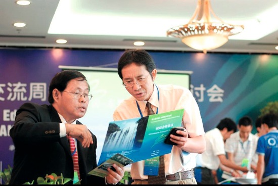 2009年8月,柬埔寨智慧大學(xué)校長Dr. Chea San Chanthan(左)在首屆“中國-東盟教育交流周”上與中國高校參會(huì)嘉賓親切交流