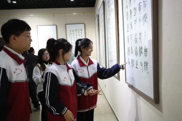 學(xué)生在欣賞書法藝術(shù)展。寶坻區(qū)第一中學(xué)供圖