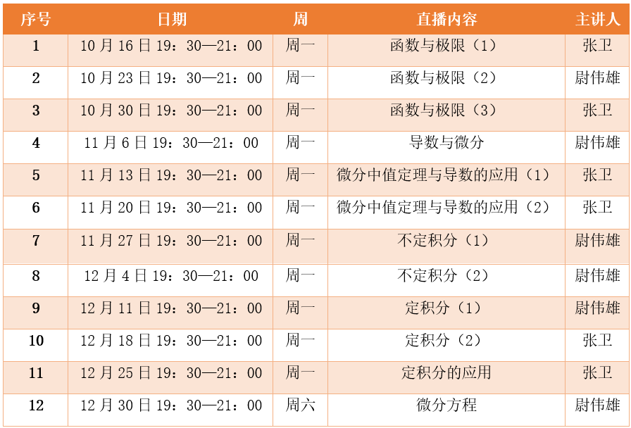 中國(guó)教育新聞網(wǎng)訊(記者 焦小新)金秋十月,為了幫助大學(xué)生夯實(shí)高數(shù)基礎(chǔ)的同時(shí)拓展高數(shù)思維,并助力有考研需求的同學(xué)們快速突破高數(shù)重難點(diǎn)題型,高等教育出版社計(jì)劃從2023年10月16日至2023年12月30日推出“高等數(shù)學(xué)重難點(diǎn)穿透輔導(dǎo)”系列課程,共設(shè)置12場(chǎng)直播。