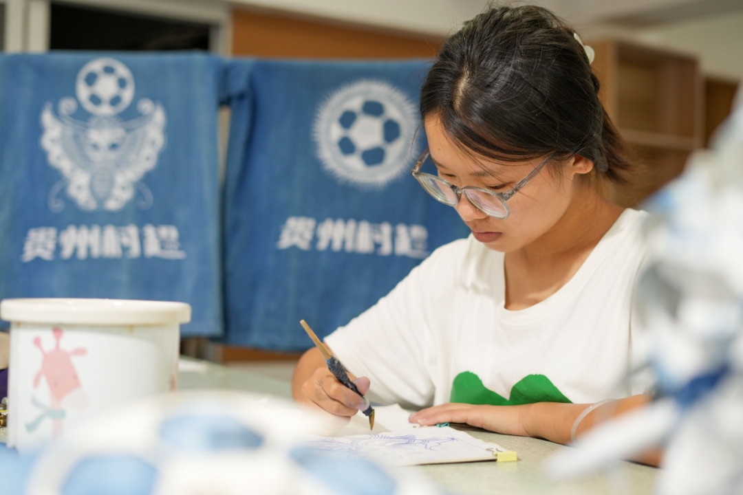 學(xué)生在貴州省黔東南民族職業(yè)技術(shù)學(xué)院校內(nèi)實(shí)訓(xùn)基地創(chuàng)作“村超”主題蠟畫。 蔡興文 攝