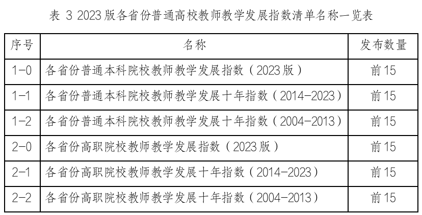 關(guān)于分省的教師教學(xué)發(fā)展指數(shù),2023年全新推出山東省、廣東省本科及廣東省高職院校教師教學(xué)發(fā)展指數(shù),繼續(xù)發(fā)布第2輪江蘇省、湖北省本科院校教師教學(xué)發(fā)展指數(shù)、第3輪陜西省本科院校教師教學(xué)發(fā)展指數(shù),繼續(xù)發(fā)布第4輪浙江省本科院校教師教學(xué)發(fā)展指數(shù)和第3輪浙江省高職院校教師教學(xué)發(fā)展指數(shù),省域指數(shù)不斷擴(kuò)展,內(nèi)容更加豐富。