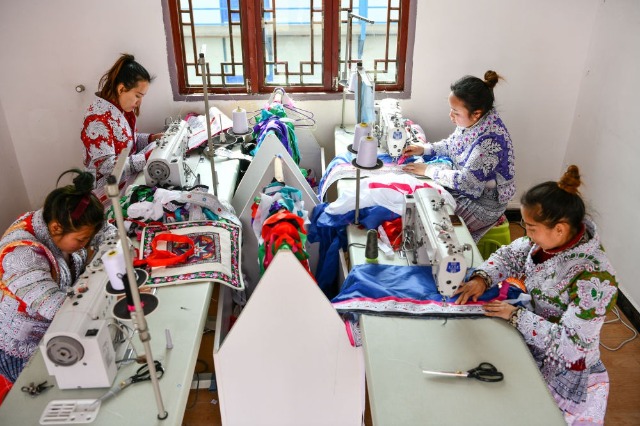 在貴州省畢節(jié)市黔西縣新仁苗族鄉(xiāng)化屋村,苗族繡娘們在制作苗族服飾(2021年2月20日攝)。新華社記者 楊文斌 攝