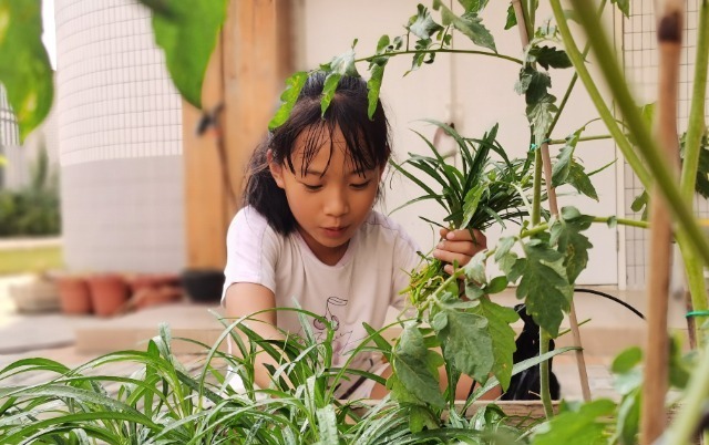 陳意曼:我的童年是在山野間度過的,學校就在山腳下,孩子們一下課就跑到山上去玩。記得3月的茶花開時,我們會去山上找一種蕨類植物,扯一根在手中,把中間的芯拔掉,就是一根吸管,我們會用它去吸茶花里的花蜜,很甜的。山里有各種各樣的野生植物,我們在山上就可以吃飽肚子。我們還會把口罩拆了做成網(wǎng)兜,用它來抓蚯蚓和青蛙,再去喂雞、養(yǎng)鴨、種菜……現(xiàn)在回想起來,天地和大自然就是我們的學習場,我們一直是在玩中學會解決各種真實問題的。童年的經(jīng)歷讓我相信,生活即教育。所以,文惠小學的校園即使很小,也會開辟出地方,讓孩子們種植各種植物,體驗二十四節(jié)氣的變化。