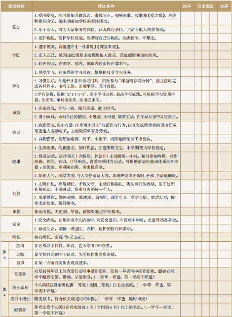 沒有賞識(shí)就沒有教育,每個(gè)孩子都有得到贊賞的渴望。期末“10+n+4”的評(píng)選(見表2),目的是為不同層面的學(xué)生提供得到賞識(shí)的機(jī)會(huì),讓每個(gè)學(xué)生的閃光點(diǎn)都能被發(fā)現(xiàn)、發(fā)揚(yáng)。一學(xué)期結(jié)束后,每個(gè)學(xué)生都會(huì)在10個(gè)方面開展自評(píng)和他評(píng),包括愛心、守紀(jì)、學(xué)習(xí)、誠(chéng)信、勞動(dòng)、健康、禮儀、出勤、安全、特長(zhǎng)等,每個(gè)方面都有相應(yīng)的具體表現(xiàn)供學(xué)生參考。“+n”獎(jiǎng)包括“杰出”獎(jiǎng),要求在區(qū)級(jí)以上科技、體育、藝術(shù)等項(xiàng)目中獲獎(jiǎng);“貢獻(xiàn)”獎(jiǎng)要求是學(xué)校社團(tuán)的主力隊(duì)員,為學(xué)校作出突出貢獻(xiàn);如果在某一方面有突出表現(xiàn)或進(jìn)步的則可以申報(bào)“自擬”獎(jiǎng)。“+4”獎(jiǎng)包括育愛杯、錢學(xué)森杯、讀書小博士、健將杯,分別針對(duì)學(xué)生的品德、能力、閱讀、體育等方面進(jìn)行評(píng)選。上述獎(jiǎng)項(xiàng)設(shè)計(jì)體現(xiàn)多層次、多維度的評(píng)價(jià)框架,同時(shí)針對(duì)學(xué)生的個(gè)性化學(xué)習(xí)與活動(dòng)參與進(jìn)行了特別的設(shè)計(jì)。評(píng)價(jià)體系中,沒有“最好”只有“更好”,目的是使每個(gè)孩子都能被看見,都能在未來創(chuàng)造出更多的可能性。