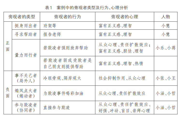 表1 案例中的旁觀(guān)者類(lèi)型及行為、心理分析