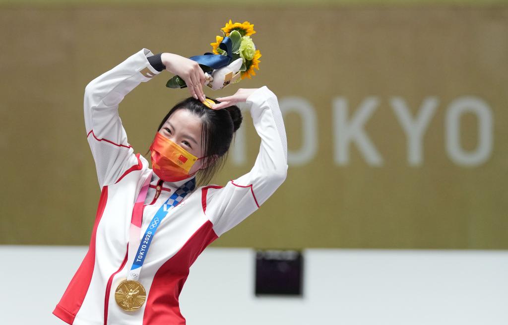楊倩在東京奧運(yùn)會(huì)的頒獎(jiǎng)儀式上