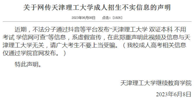 此前,天津理工大學(xué)繼續(xù)教育學(xué)院已在官網(wǎng)發(fā)布過聲明,聲明全文如下: